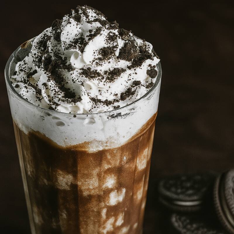 Milkshake de sorvete de Ninho com pedaços de Oreo, ganache de chocolate, creme de leite e chantilly leve para finalizar.