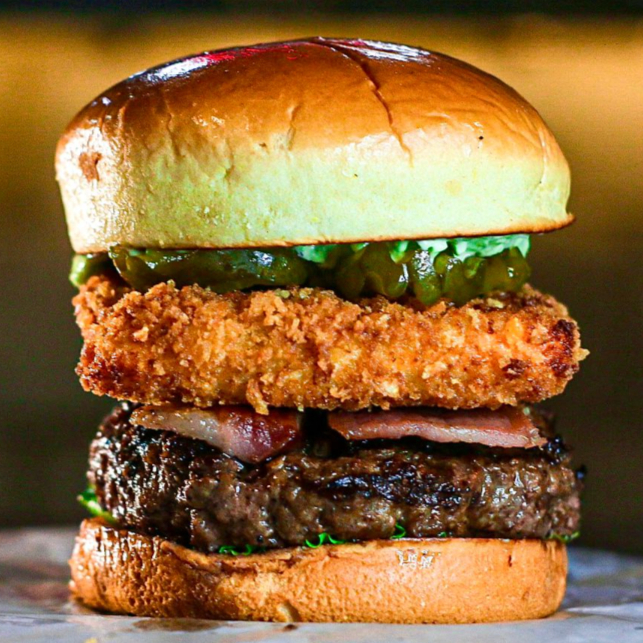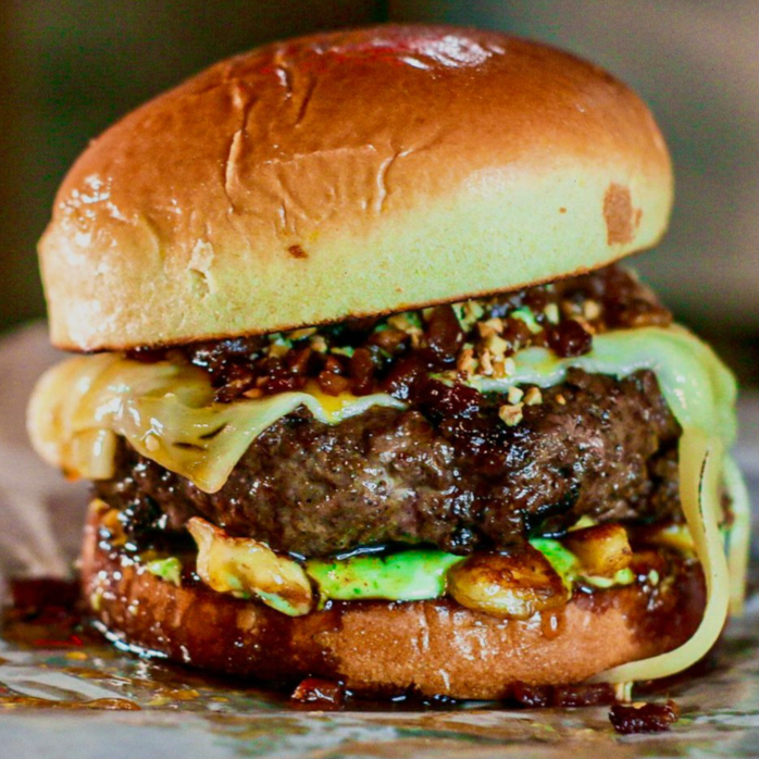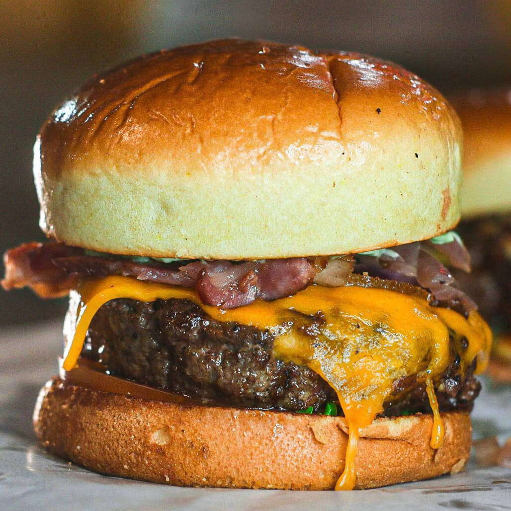 Pão brioche selado, hambúrguer bovino suculento de 200g, queijo Monterey Jack empanado, creme de cheddar puro, bacon, toque picante de molho chipotle, alface e tomates frescos.
