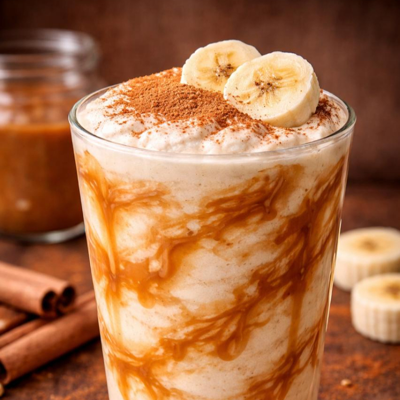 Milkshake preparado com sorvete de banana, 26g de Whey Protein, doce de leite, banana fatiada e um toque de canela. 330ml