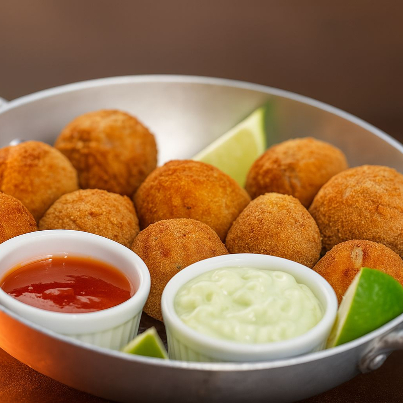 Porção de bolinhos de mandioca recheados com carne seca, servidos com molho BBQ e geleia de bacon com pimenta