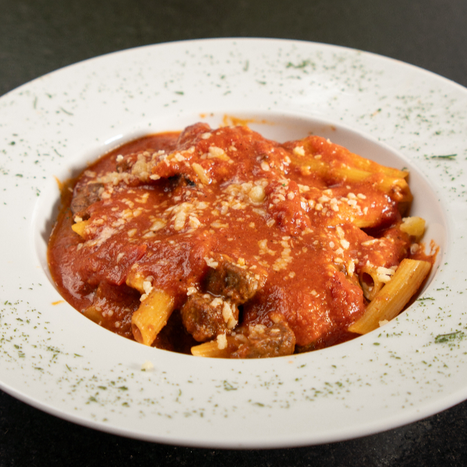 Penne al dente ao molho de tomate artesanal, finalizado com tiras de filé mignon extremamente macias e suculentas.