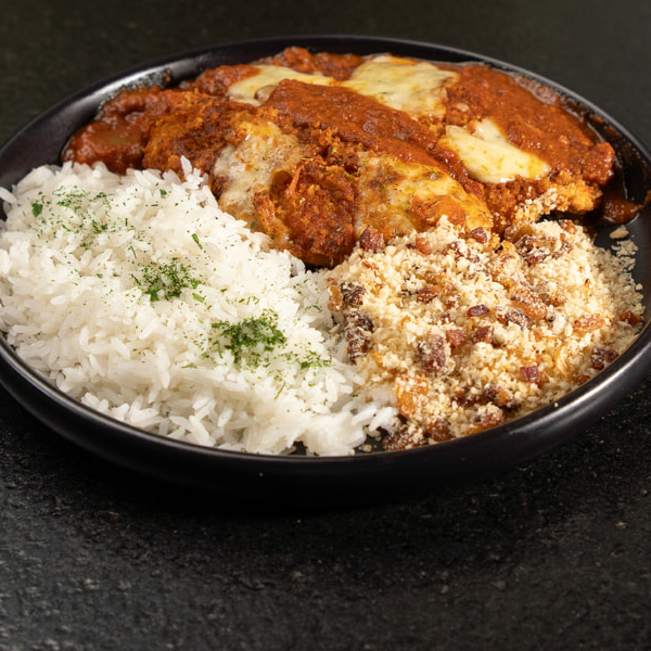 Filé de tilápia empanada, gratinado com molho de tomate artesanal e queijo derretido, servido com arroz branco e farofa de bacon com banana.