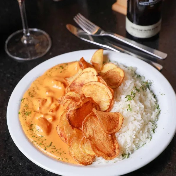 O clássico strogonoff de frango, servido com arroz e chips de batata artesanal.