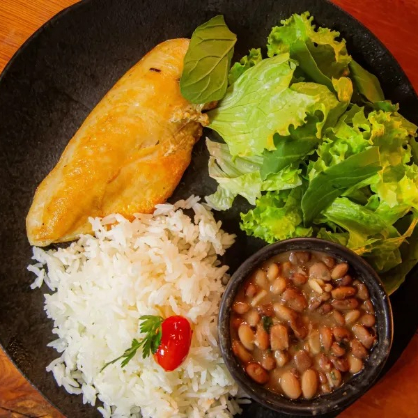 Frango grelhado, acompanhado de arroz branco, feijão em caldo e folhas frescas de alface.