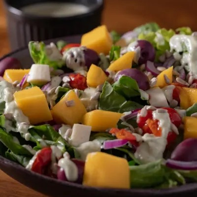 Mix de folhas (alface crespa, alface americana e rúcula), molho iogurte e hortelã, cabola roxa, queijo, azeitona preta, confit, manga e semente de girassol.