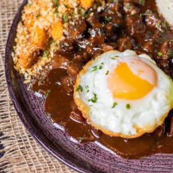 Best seller da casa! Picadinho de filé mignon ao molho roti artesanal, acompanhado por arroz branco, farofa de alho e ovo frito.