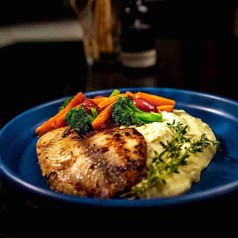 Tilápia grelhada acompanha purê de batata e legumes na manteiga.