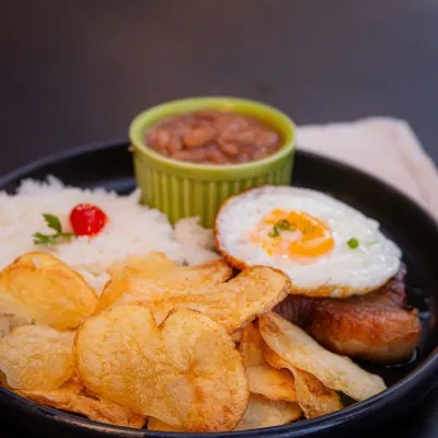 Suculento prime steak grelhado acompanhado de arroz, feijão em caldo, ovo frito e chips de batata.