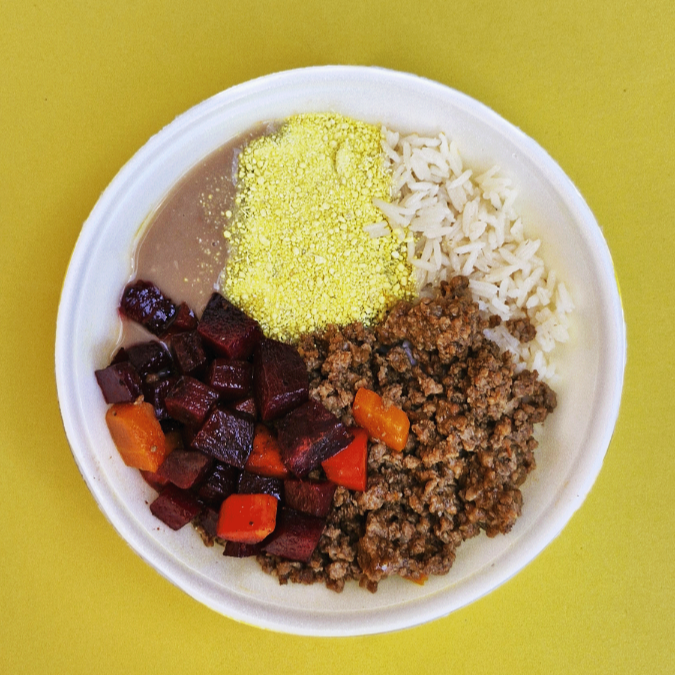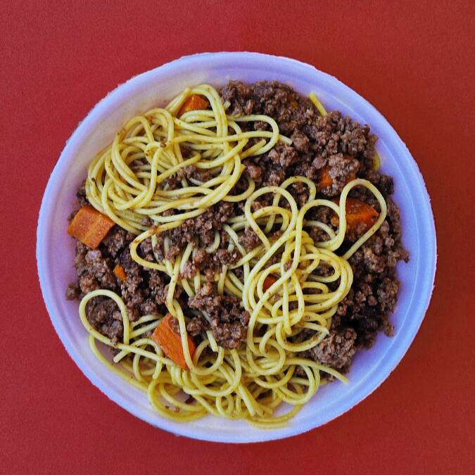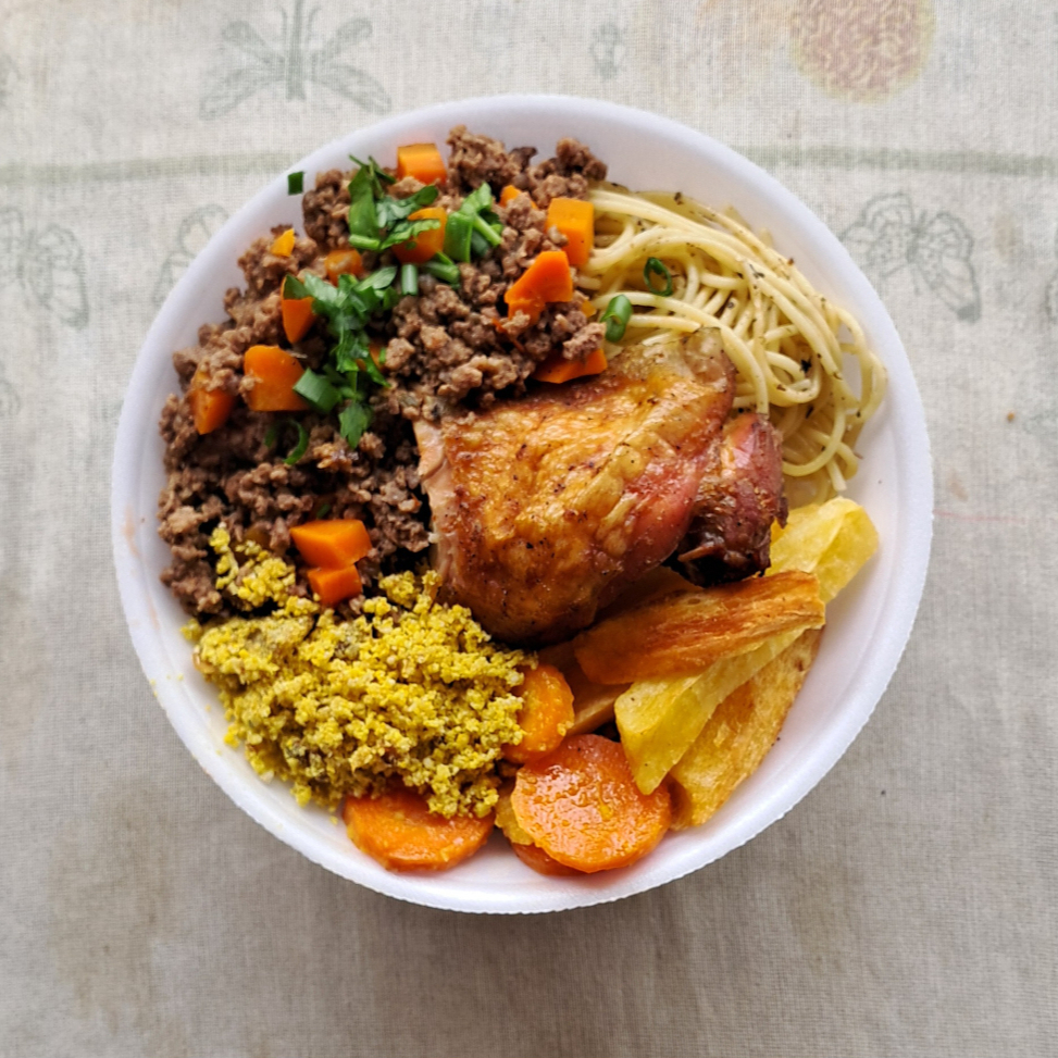 Carne moída, arroz, feijão (caldo ou tropeiro), farofa e legumes do dia refogados. 450g