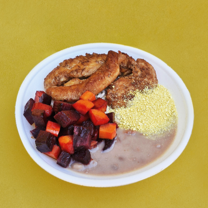 Frango grelhado, arroz, feijão (caldo ou tropeiro), farofa e legumes do dia refogados. 450g