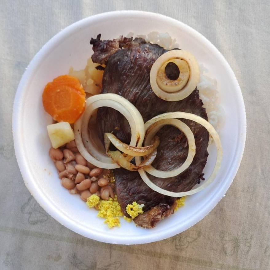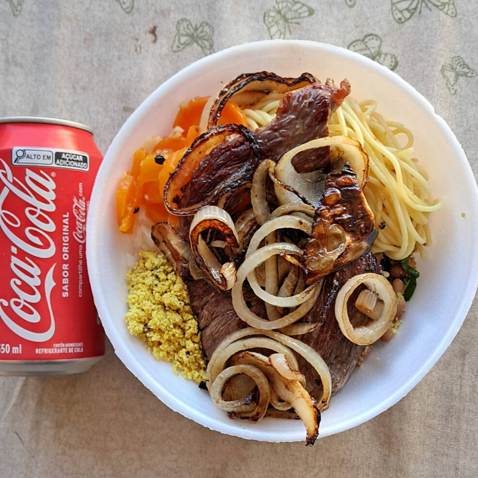 Bife acebolado, arroz, feijão (caldo ou tropeiro), farofa e legumes do dia refogados. 450g