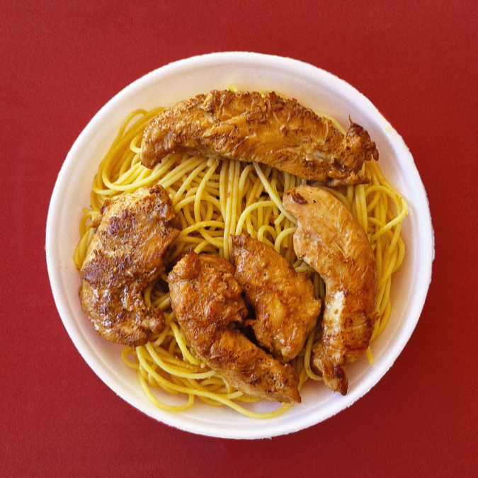 Macarrão ao alho e óleo e frango grelhado. Foto ilustrativa, 400G