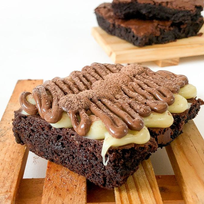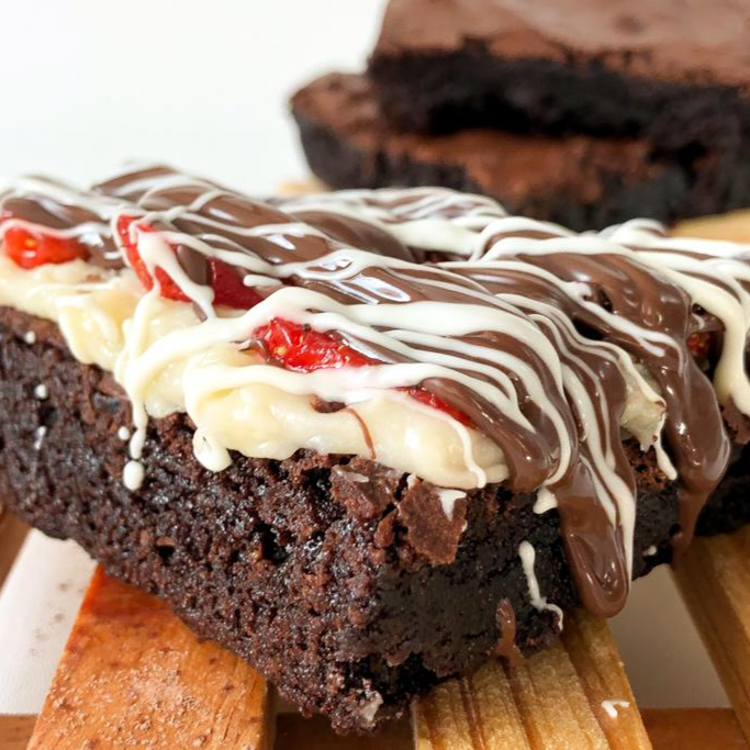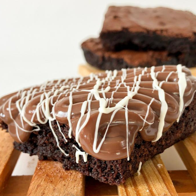 Brownie chocolatudo, coberto com brigadeiro trufado caseiro, chocolate meio amargo e linhas de chocolate branco. Brownie vida louca. Super delicioso.