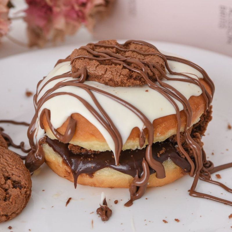 O melhor donuts foi criado, Massa que derrete na boca recheado com cookies e gananche de chocolate crocante e cremoso. Coberto com chocolate branco um cookie e suaves fitas de Nutella. Você vai se apaixonar nesse sabor que não ficou doce nem enjoativo.