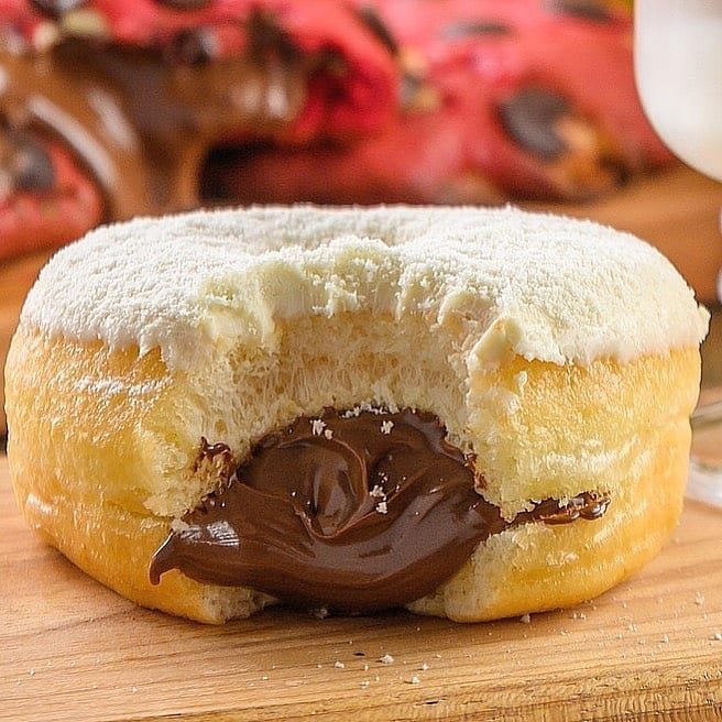 Donuts com massa fofinha que derrete na boca. Recheado com muita Nutella e coberto com fondant de glazed ou sabor de sua preferência. É o melhor donuts que vai comer hoje.