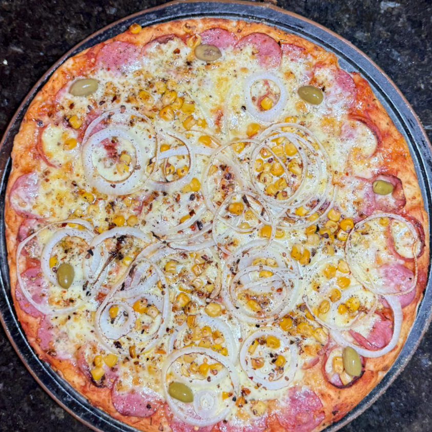 MASSA, MOLHO DE TOMATE, MUSSARELA, CALABRESA, CEBOLA, MILHO, PIMENTA CALABRESA, AZEITONA E OREGÁNO.