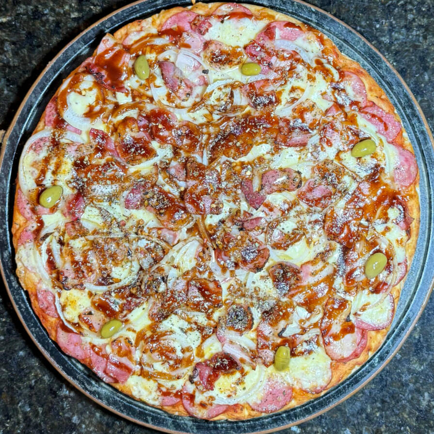 Molho de tomate, mussarela, calabresa, bacon, molho barbecue, cebola, azeitona e orégano.
