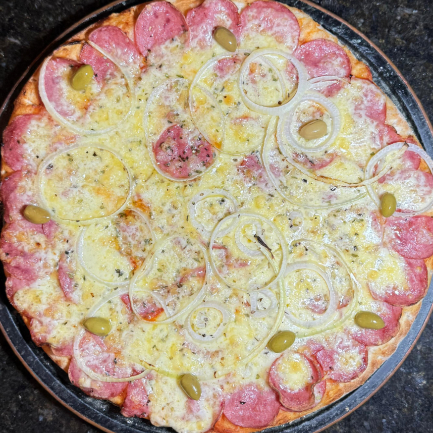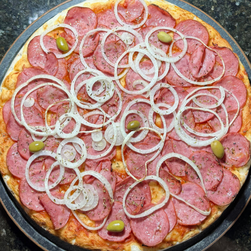 MASSA, MOLHO DE TOMATE, MUSSARELA, CALABRESA, CEBOLA, AZEITONA E OREGÁNO.