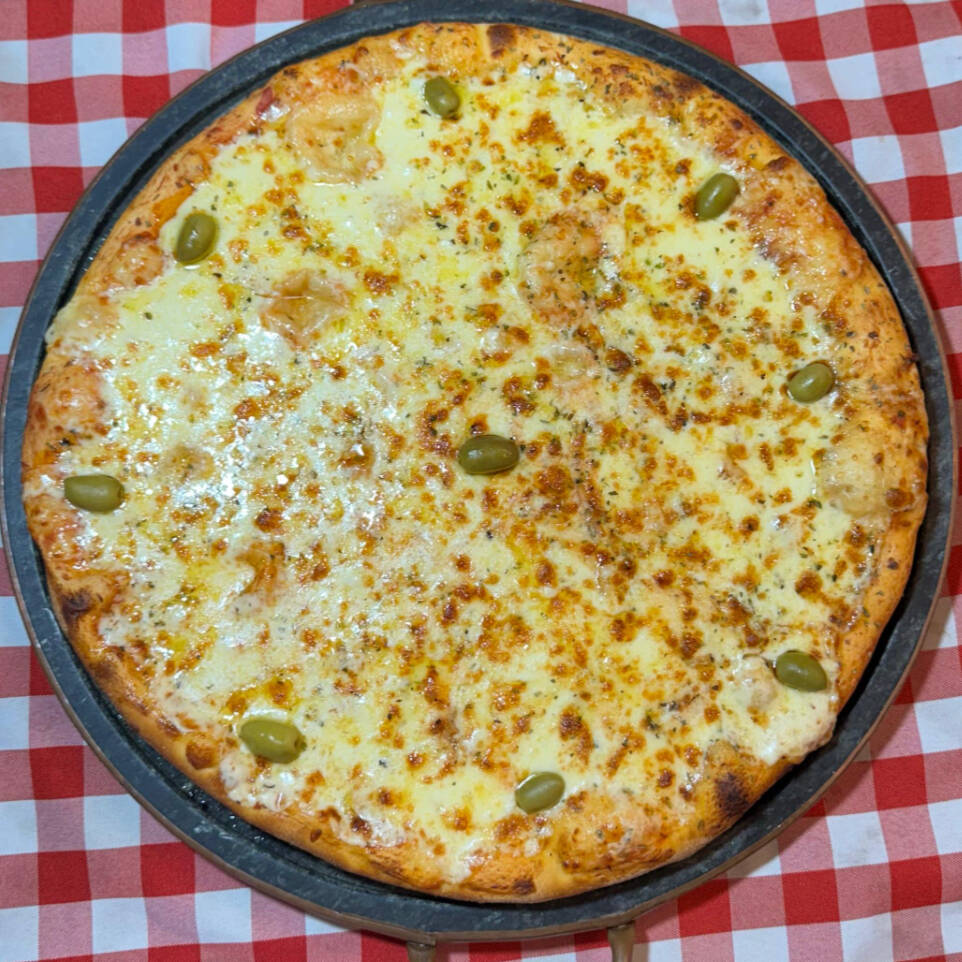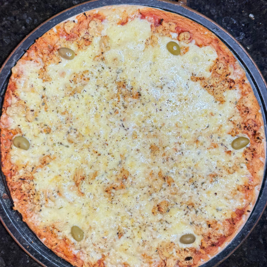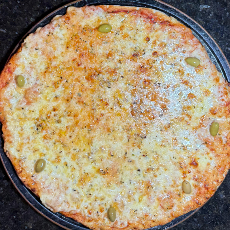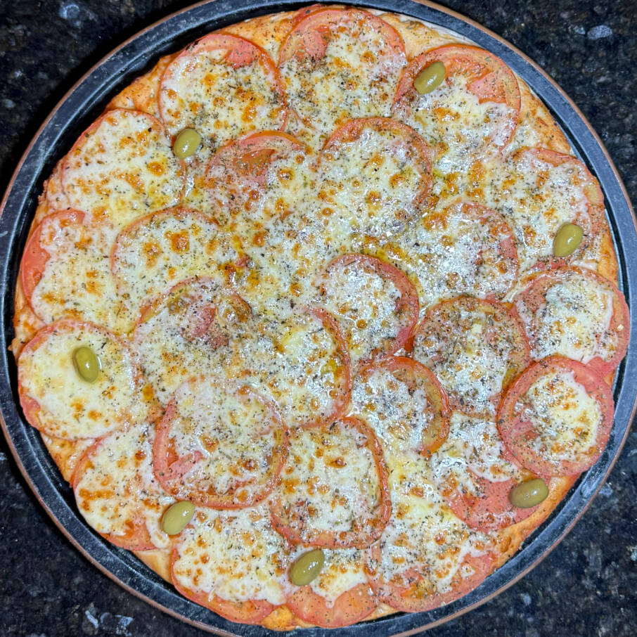MASSA, MOLHO DE TOMATE, MUSSARELA, AZEITONA E OREGÁNO.