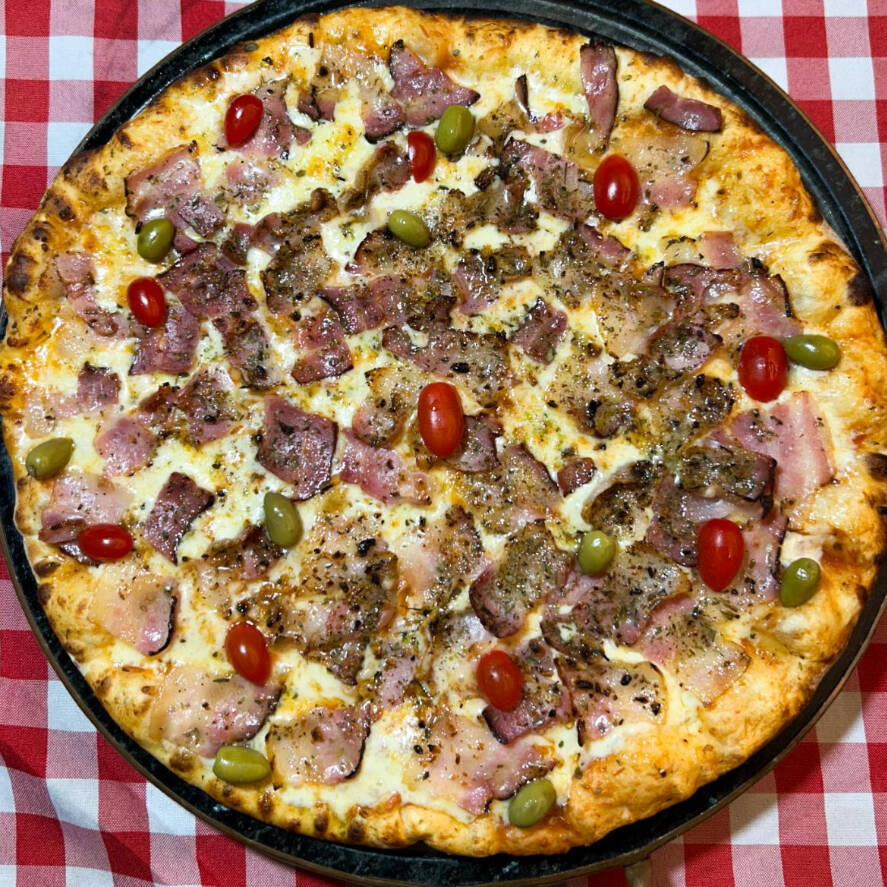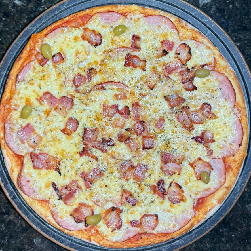 Molho de tomate, mussarela, calabresa, bacon, azeitona e orégano.