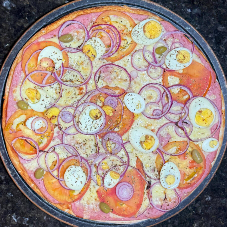 MASSA, MOLHO DE TOMATE, MUSSARELA, PRESUNTO FATIADO, CEBOLA, TOMATE, OVO, AZEITONA E OREGÁNO.