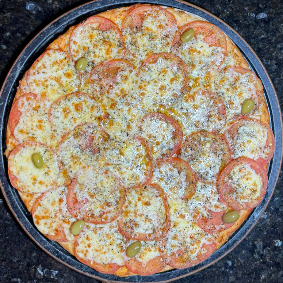 MASSA, MOLHO DE TOMATE, MUSSARELA, TOMATE, MANJERICÃO EM PÓ, AZEITONA E OREGÁNO.
