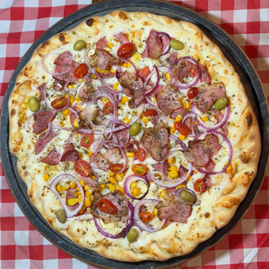 Molho de tomate, mussarela, frango, calabresa, bacon, requeijão cremoso original, milho, cebola roxa, tomate grape, azeitona e orégano.