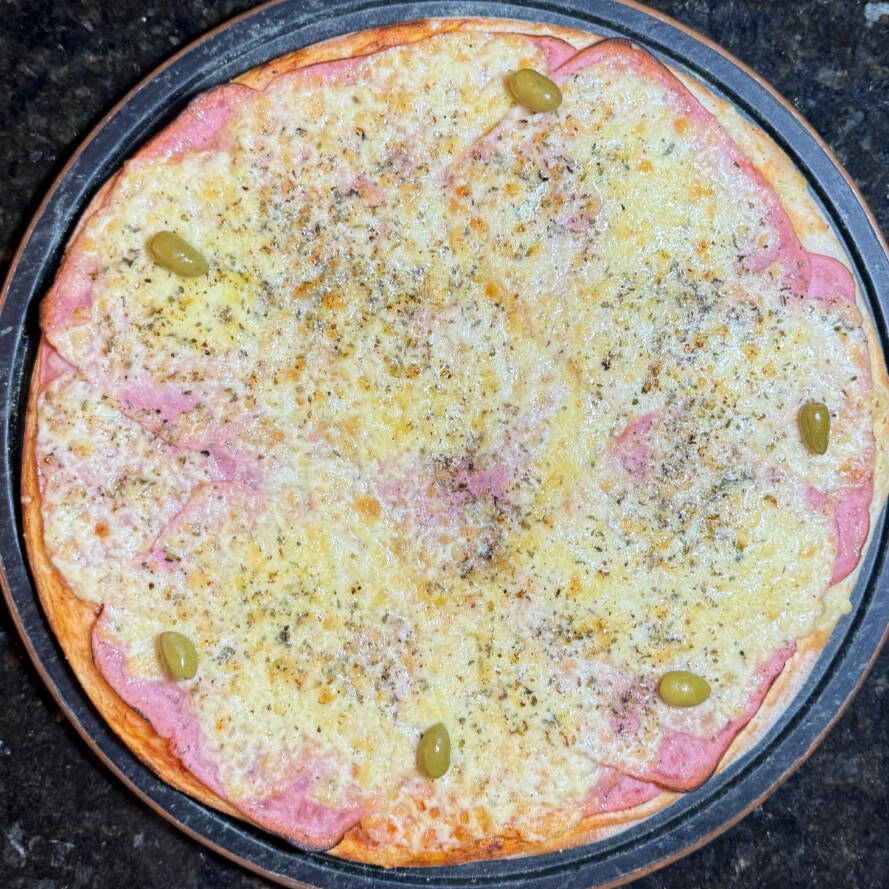 MASSA, MOLHO DE TOMATE, MUSSARELA, PRESUNTO FATIADO, AZEITONA E OREGÁNO.