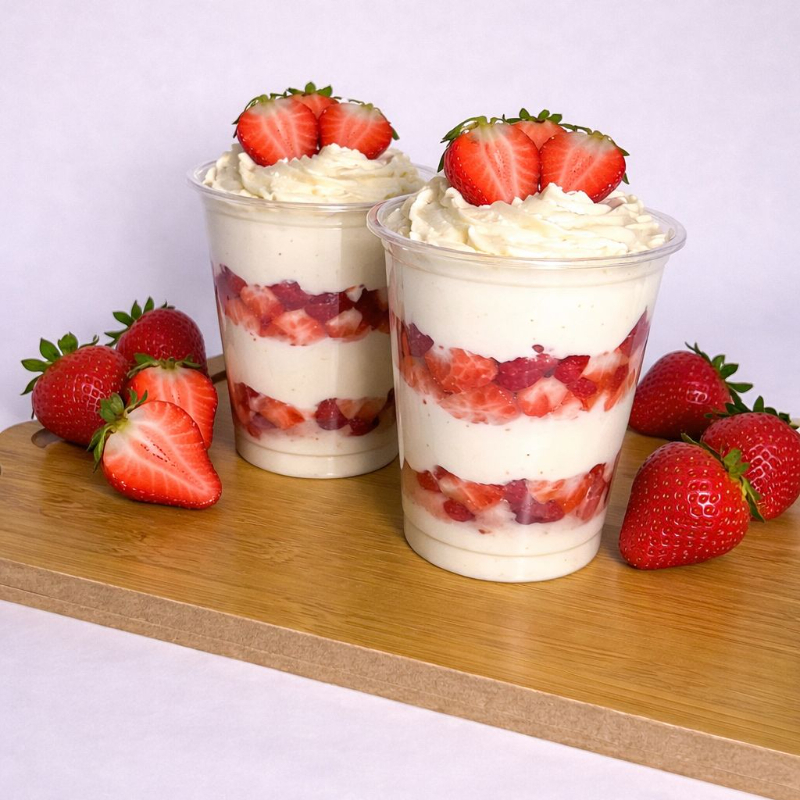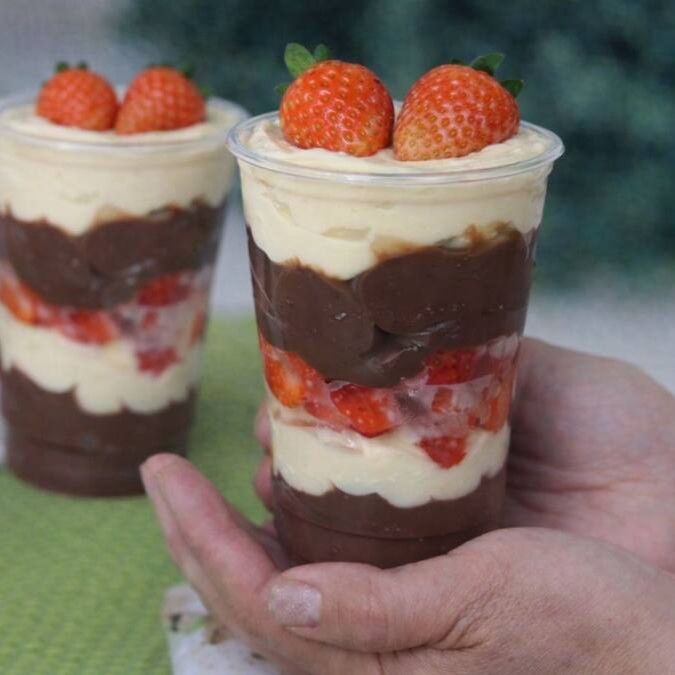 Camadas de creme de ninho com mousse de ninho e morangos frescos