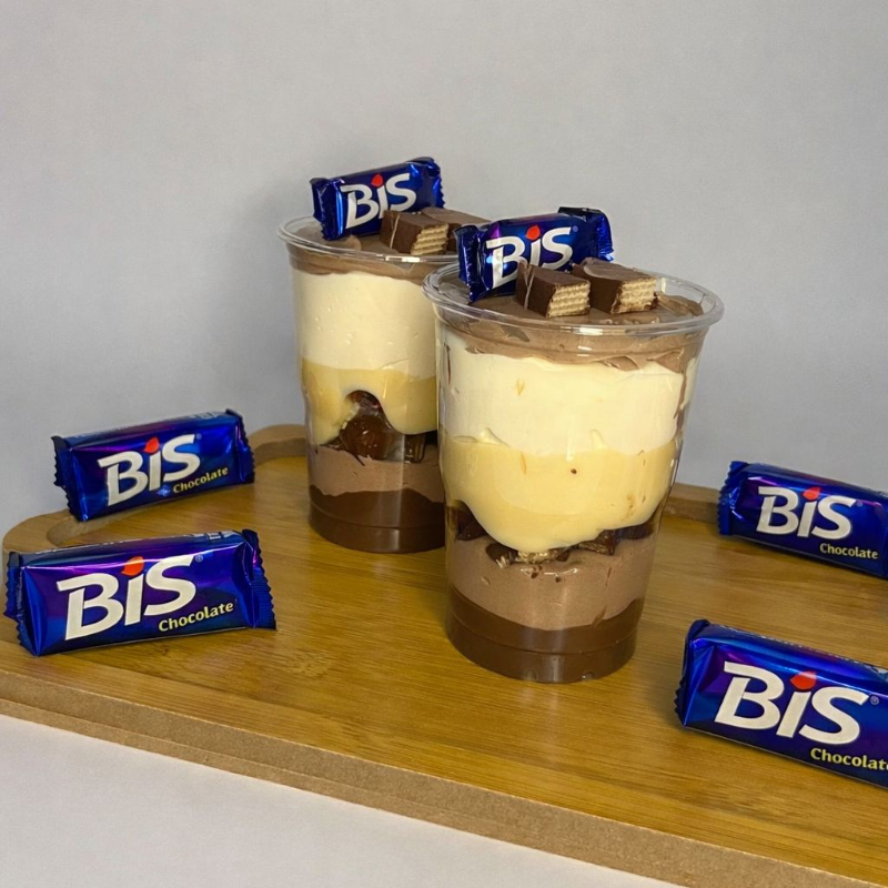 Camadas de creme de chocolate (70% cacau), creme de ninho (Leite Ninho) e Bis