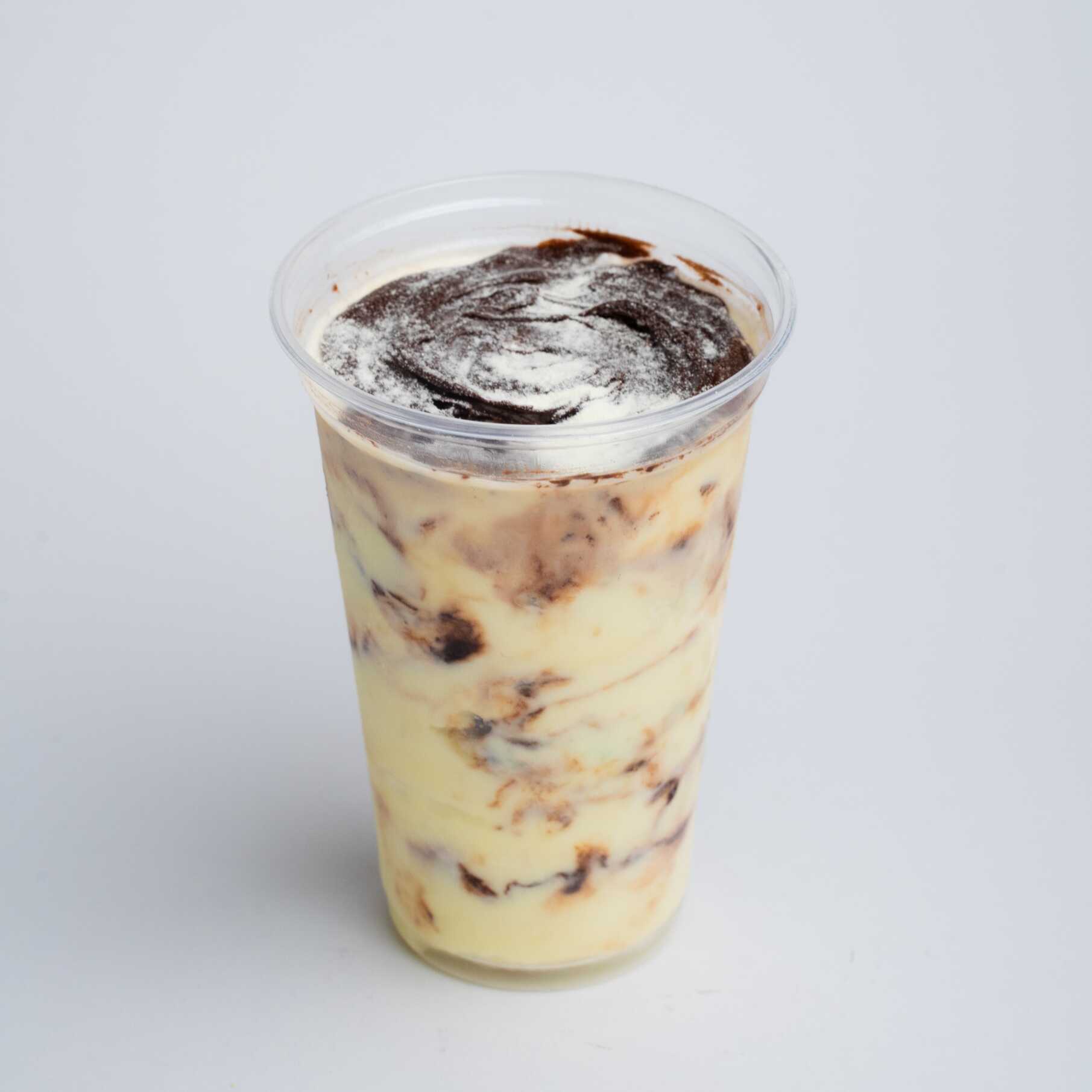 Delicioso sorvete de ovomaltine, com cobertura de chocolate e finalizado com toque de farelo de ovomaltine.