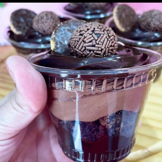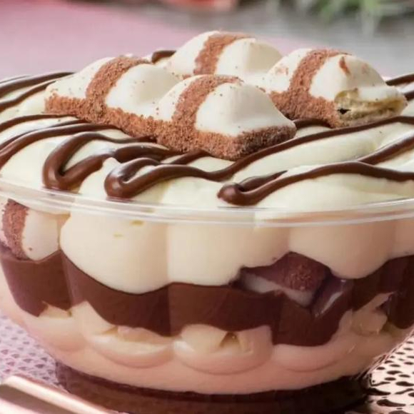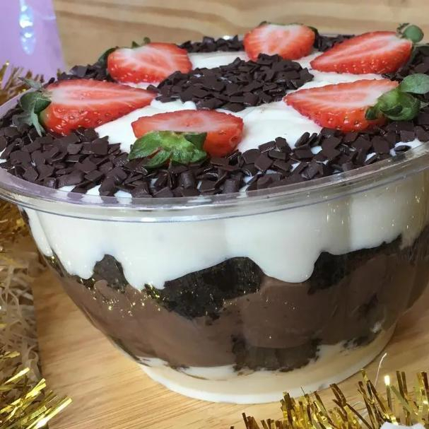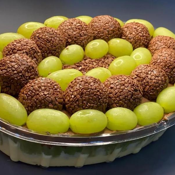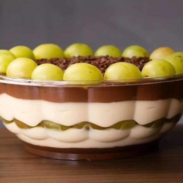 Travessa de aproximadamente 1 litro, com camadas de brigadeiro meio amargo, com nosso suave creme belga e Uvas sem semente. Serve de 5 a 6 pessoas