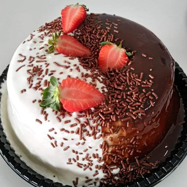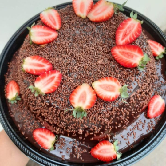 MASSA DE CHOCOLATE COM COBERTURA DE NINHO COM MORANGOS