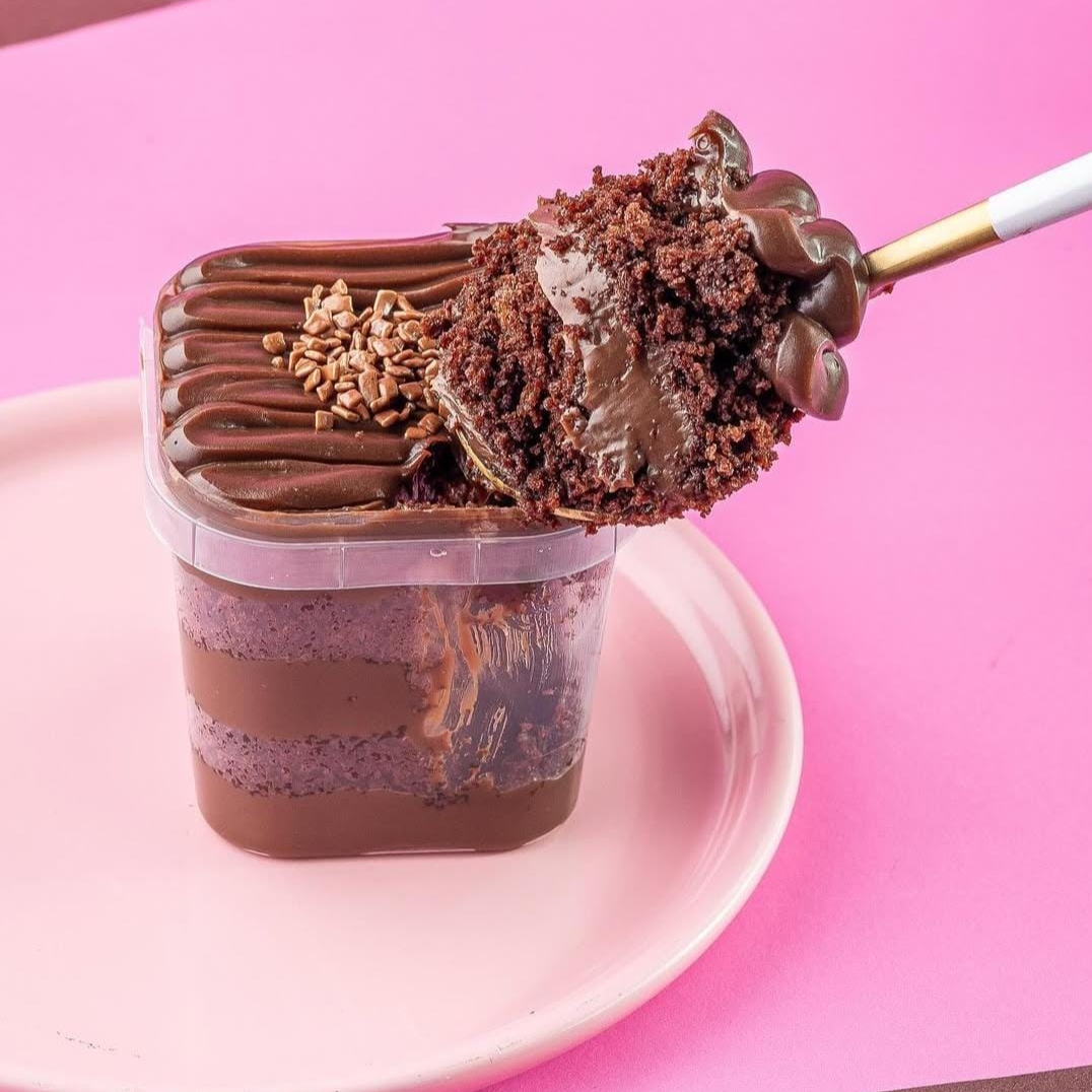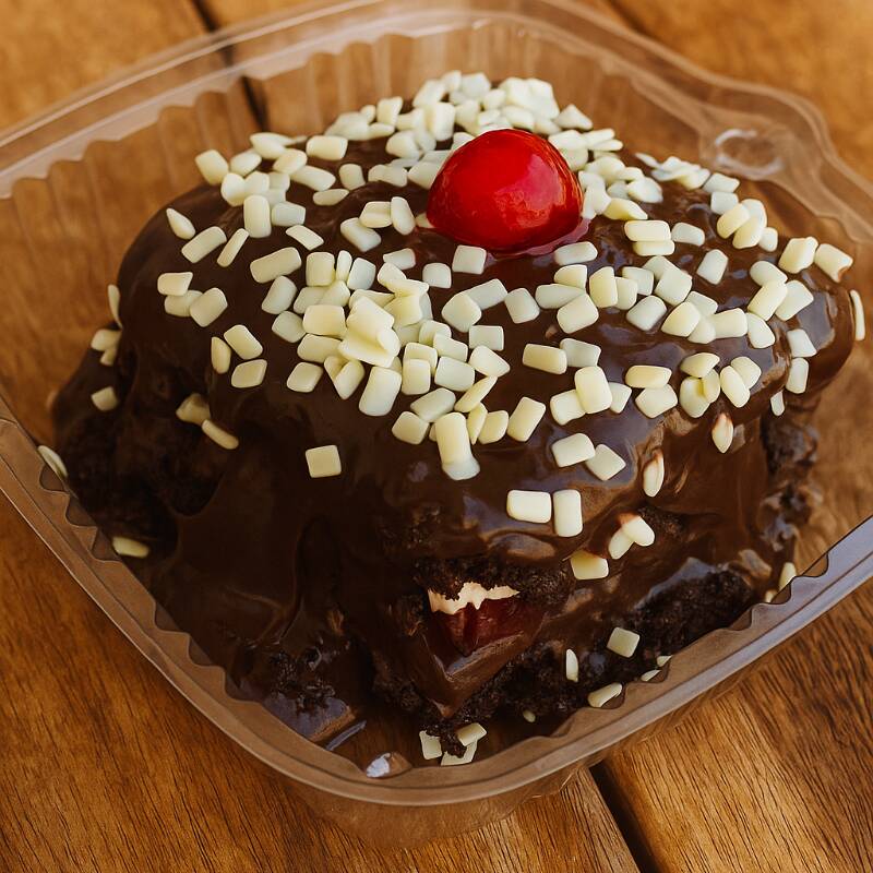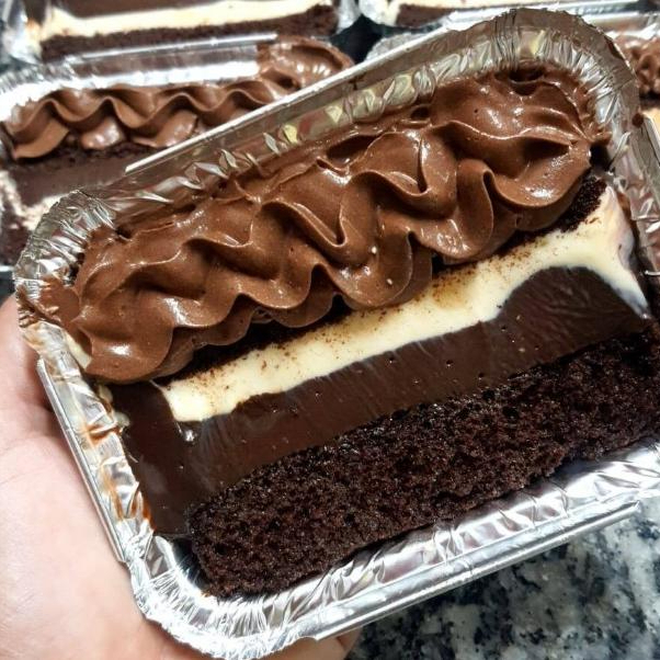 Bolo super molhadinho de massa de Chocolate com recheio de creme brigadeiro branco e brigadeiro meio amargo. Com cobertura de Mousse de Chocolate. Fatia de 185g