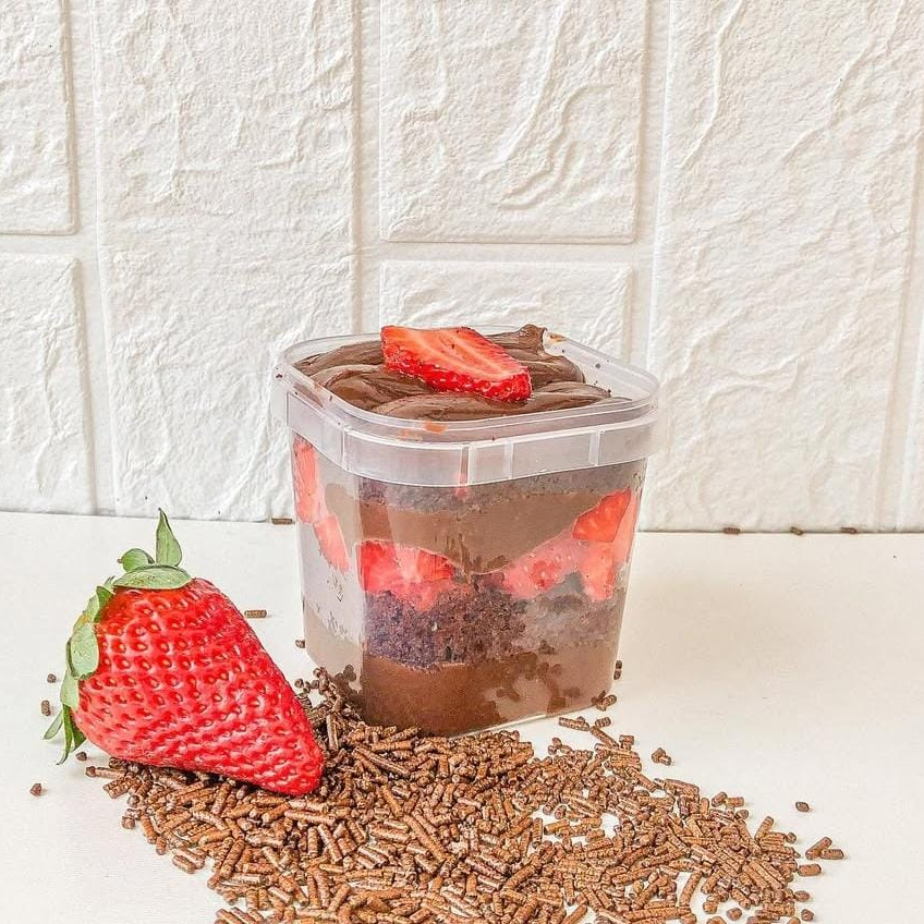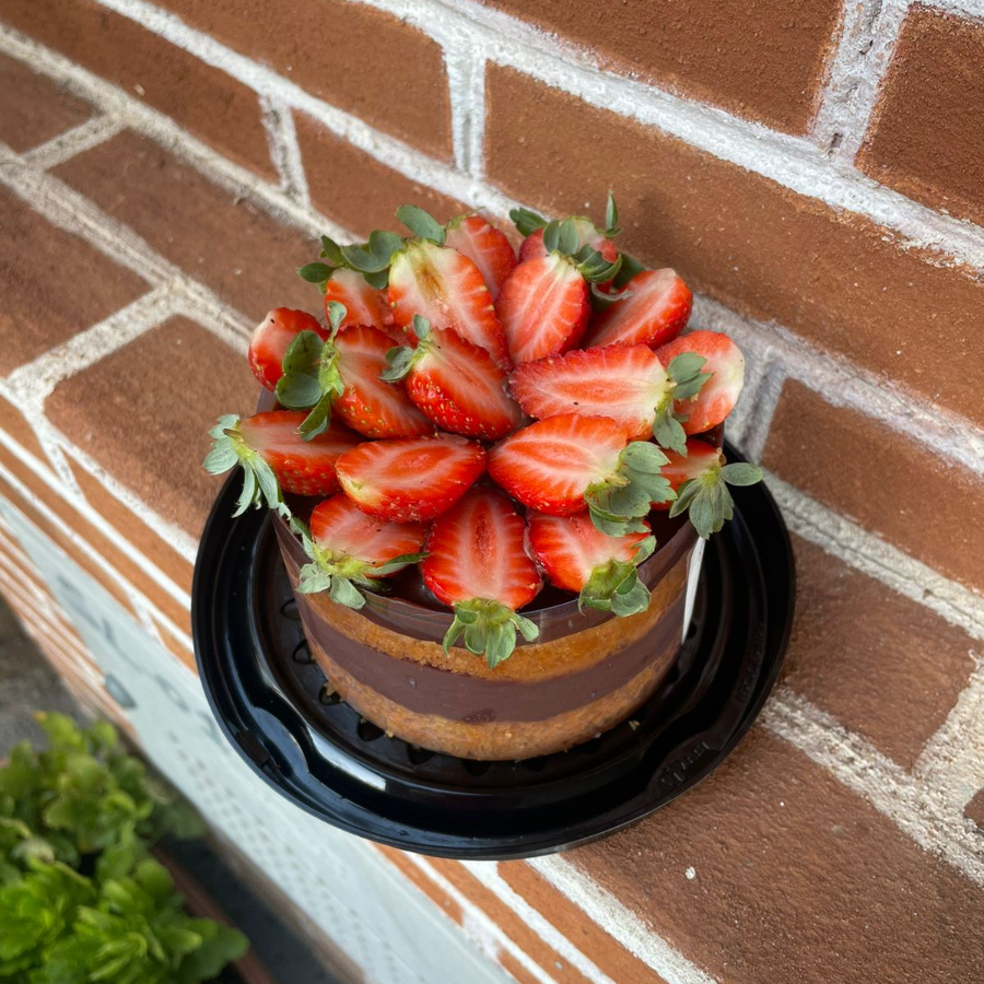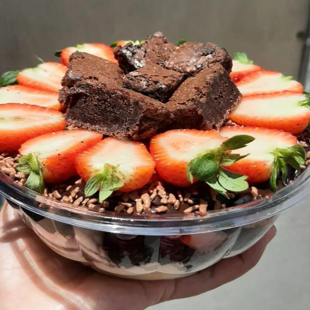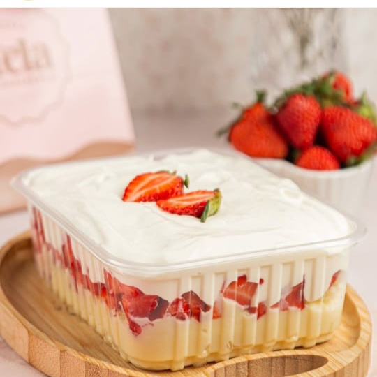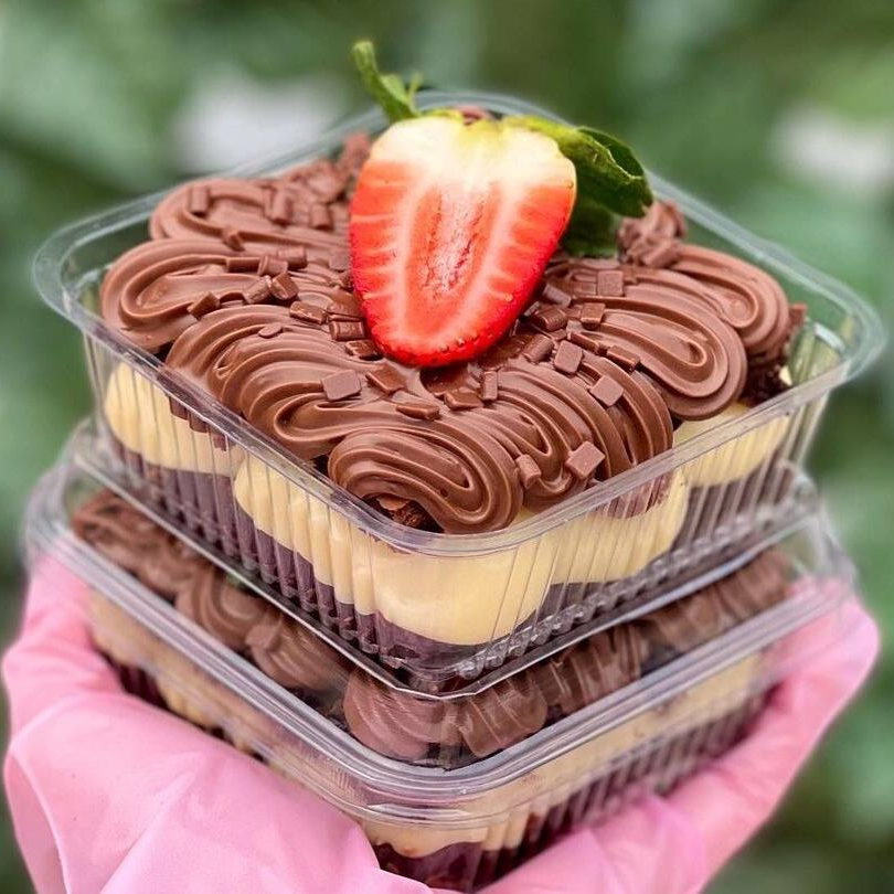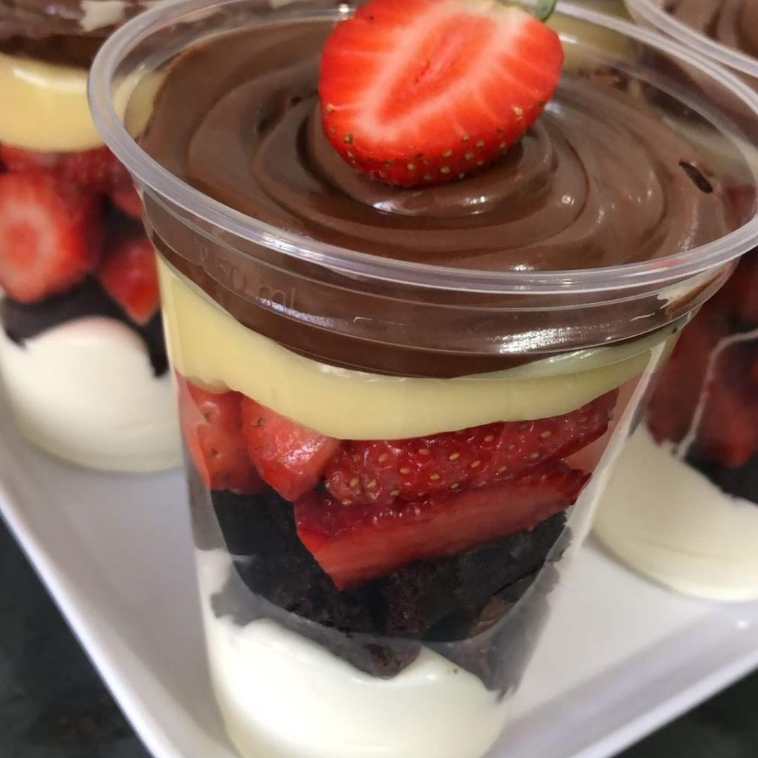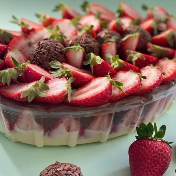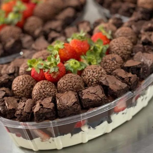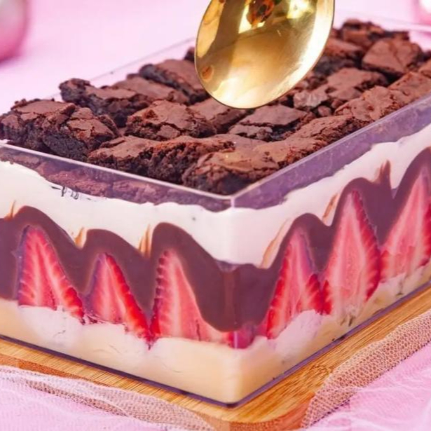 Caixa de acrílico com camadas de creme belga, morangos frescos, brigadeiro, mousse de Ninho e bastante brownie. Aproximadamente 2kg. Serve em media 15 pessoas