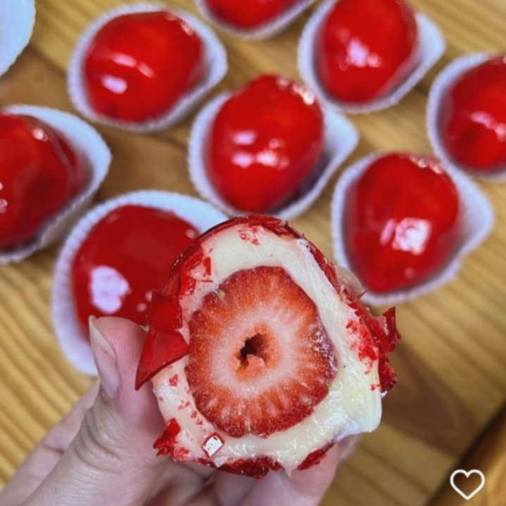Delicioso morango coberto com creme de chocolate branco e caramelo vermelho