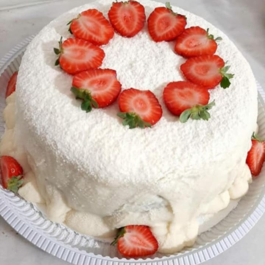 Creme belga com morangos picados e finalizado com ganache de chocolate e morangos na decoração. Torta suave e bem gostosa. Serve de 15 a 18 pessoas.