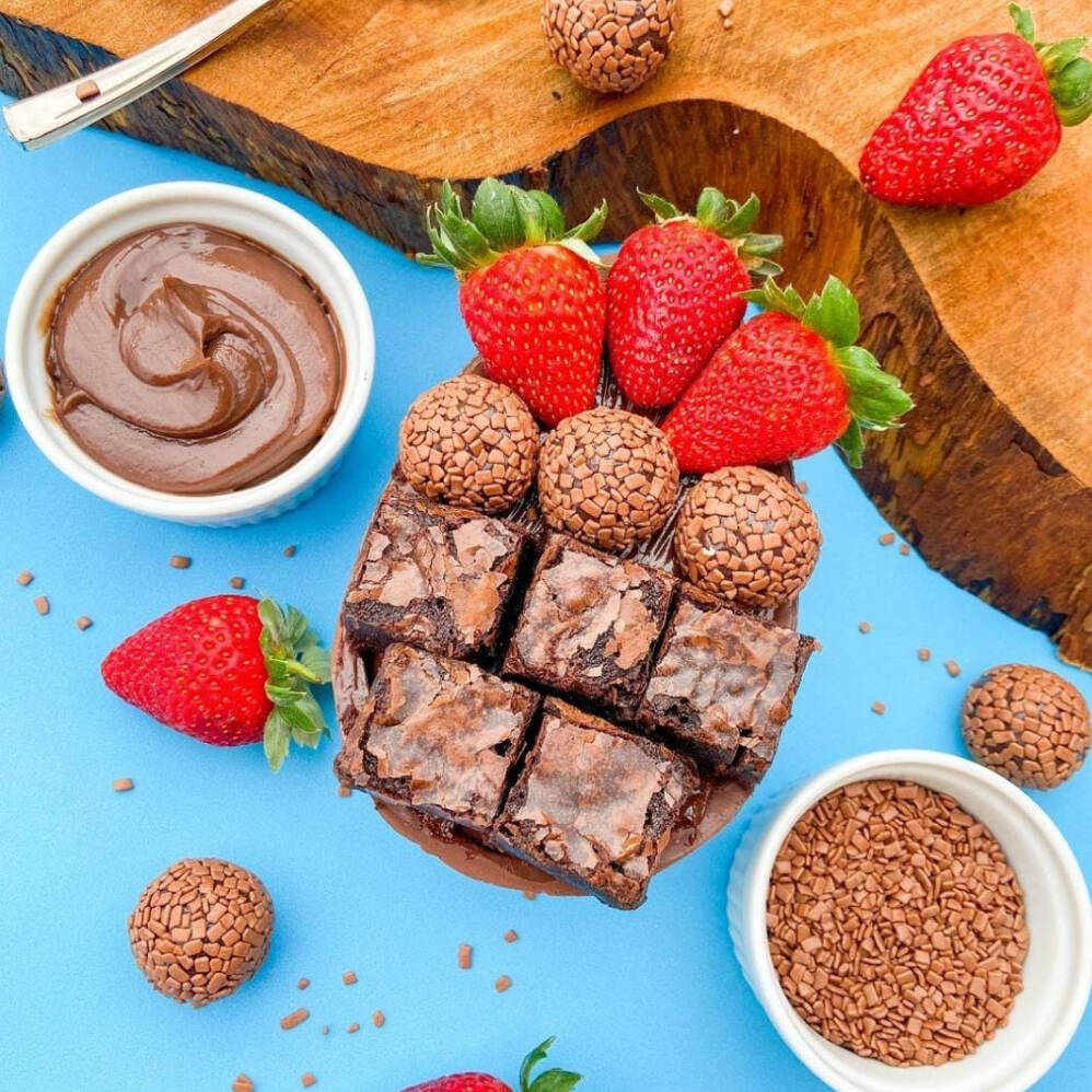 Torta na travessa Maravilhosa de mousse de leite Ninho, com bastante Morango frescos, bronwie super macio e nosso maravilhoso brigadeiro meio amargo. Decoração docinhos e morango. Serve 15 pessoas a 18 pessoas.