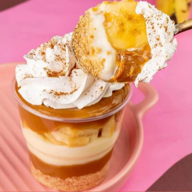 FAROFINHA DE BOLACHA , DOCE DE LEITE CASEIRO, CREME BELGA SUAVE E BANANA CARAMELIZADA
