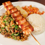 Frango Grelhado com Bacon Crocante, Acompanhado de Arroz Soltinho, Feijão Tropeiro com Bacon e Calabresa, Mandioca na Manteiga e Vinagrete Fresquinho. Uma Jantinha Completa Que Dá Água na Boca!