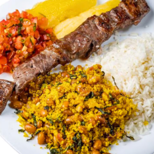 Duas Jantinhas Completas com Arroz Soltinho, Feijão Tropeiro com Bacon e Calabresa, Mandioca na Manteiga e Vinagrete, Acompanhadas de Dois Espetinhos à Sua Escolha. Ideal Para Dividir a Dois!