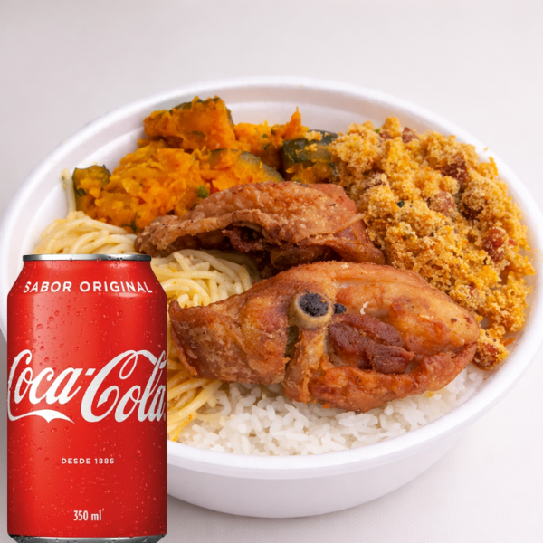 Escolha Sua Carne do Dia e Monte Seu Marmitex com Arroz Fresquinho, Feijão de Caldo ou Tropeiro . Acompanha Coca-Cola Original 350ml Bem Gelada Para Completar o Almoço!