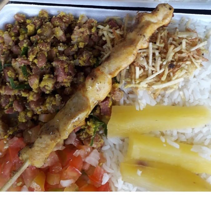 Arroz,feijao tropeiro,vinagrete,batata palha,mandioca,espetiho de frango.
