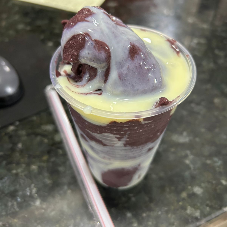 Creme de açai feito com leite congelado, polpa de açai, açucar e polpa de açai,