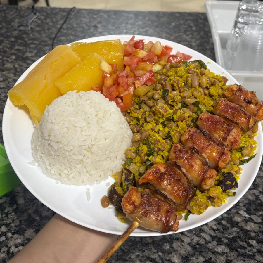 Jantinha média sem espeto. Acompanha arroz, feijão tropeiro, mandioca cozida e vinagrete.