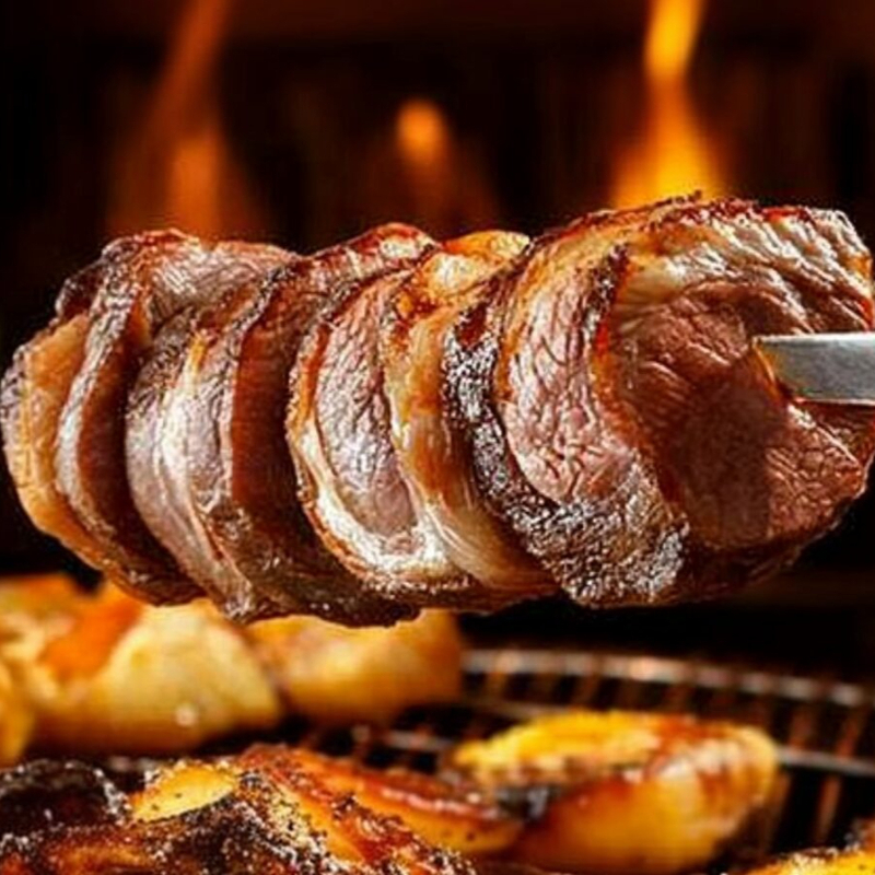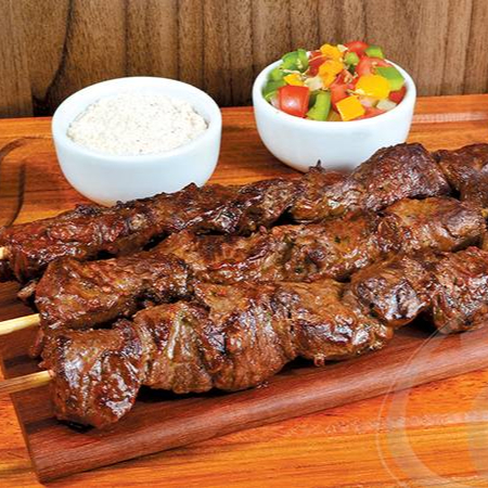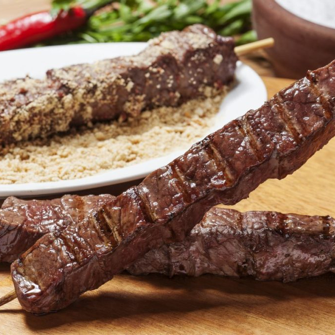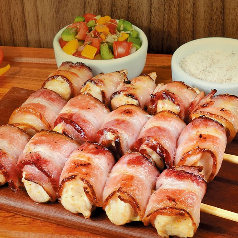 Deliciosos pedaços de frango marinados e grelhados no espeto, temperados com ervas e especiarias.