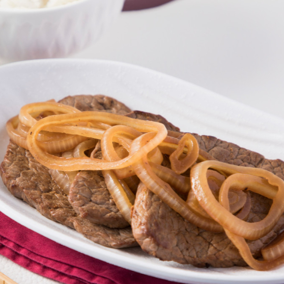 Porção Grande de bife acebolado para 4 pessoas, acompanhando arroz, feijão de caldo e salada de alface e tomate. Perfeito para você e sua família.