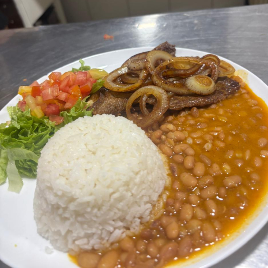 Prato feito completo com bife grelhado no ponto perfeito, arroz soltinho, freijão temperado e salada frescsa.