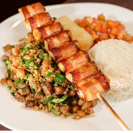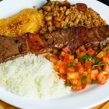 Arroz, Feijão tropeiro, Mandioca, vinagrete e torresmo