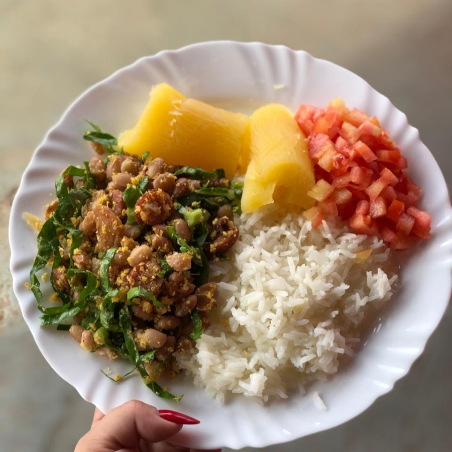 Arroz, Feijão Tropeiro, Mandioca, Vinagrete (Sem Cebola), Salada de Repolho e Cenoura. OBS: Caso Tem Algo Que Não Queira, Por Favor Colocar Na Observação.